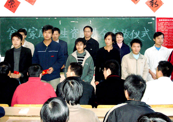 在罗木枝老师宣读了本次被资助的贫困学生名单后,系领导、老师为贫困学生发放了资助基金,被资助的学生都对院系领导、老师和全体同学表示深深地感谢。万书记在讲话中指出:你们生活上的困难是暂时的,但是你们的技能知识、理论知识不能贫穷,我们的精神决不能贫穷,希望我们的贫困学生努力克服生活上的困难,发愤学习,回报学校和社会。
