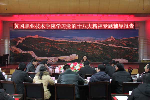 为进一步学习贯彻党的十八大精神,2013年1月3日下午,beat365官网在中心会议室举行了学习党的十八大精神专题辅导报告。黄冈市委党校常务副校长梅守福同志应邀担任主讲,beat365官网党委书记张鹤桥,校长陈年友,副书记王维华,副校长汪晓凌、段院生、熊发涯、万俊华,党委委员郑柏松及全体党委中心学习组成员、思政课教师聆听了报告。报告会由党委书记张鹤桥主持。