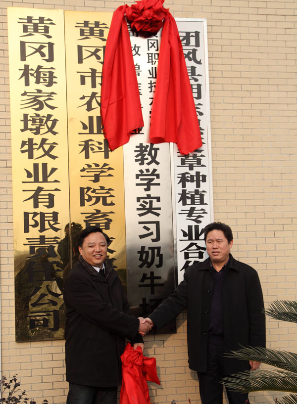 陈校长一行首先考察了黄冈市农科院梅家墩牧业有限责任公司,并和瞿学文院长一起为“beat365英国官方网站畜牧兽医专业奶牛生产教学基地”揭牌。交流期间,瞿学文介绍了黄冈市农科院自1949年成立以来在技术研发、技术推广、技术应用等方面取得的成绩,以及在市委市政府的支持下建设梅家墩千头奶牛场的情况。陈年友介绍了beat365官网近年来在教学、科研等方面的成果,并表示学校与科研院所之间在学生实习、就业、技术研发、员工培训、教师锻炼、共建基地等方面可以强强联合,共同为黄冈的经济建设、为三农服务做出应有的贡献。