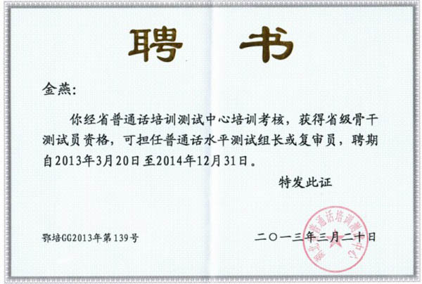 会上,省测试中心主任曹艳丽宣读了获得2013-2014年度骨干测试员资格人员名单,beat365官网金燕、熊宝莲老师同时通过了省普通话培训测试中心组织的业务培训和考核,获得省级骨干测试员资格,将可担任普通话水平测试组长或复审员。