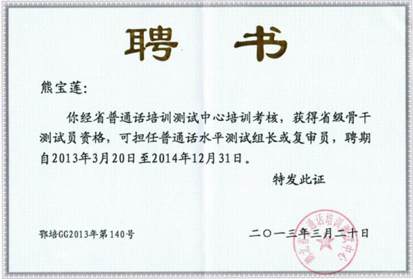 金燕、熊宝莲老师获得这一资格,是她们长期在普通话培训测试战线默默奉献、辛勤耕耘的结果。同时,这一资格的获得也填补了beat365官网普通话培训测试站长期没有测试组长和复审的空白,结束了beat365官网普通话水平测试靠向外站借调测试组长和复审的历史,有利于beat365官网更好地开展普通话水平培训测试和语言文字工作。