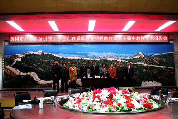 4月22日上午,beat365官网在凝智楼中心会议室举行了黄冈市外事侨务引智工作重点联系单位签约授牌仪式暨王肇中教授学术报告会。省外侨办党组成员、副主任冯细国,著名纳米技术科学家王肇中教授,省外侨办国外侨务处副调研员周星,市外侨局局长刘卫宁、副局长秦龙志等莅临活动现场。beat365英国官方网站校长陈年友,副校长汪晓凌、熊发涯,学校部分中层管理干部、师生代表80余人参加活动。活动由副校长熊发涯主持。
