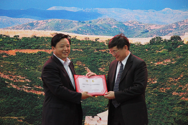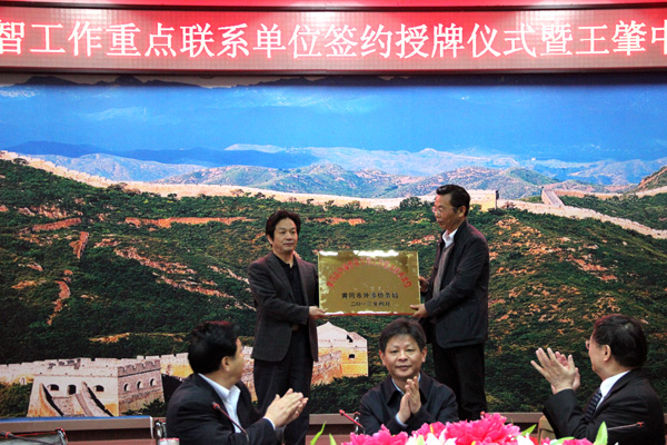 刘卫宁局长向beat365官网授“黄冈市外事侨务引智工作重点联系单位”牌匾