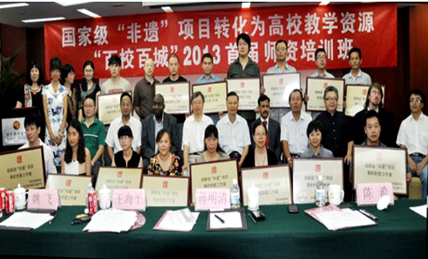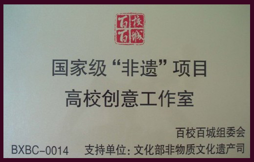 文化部非物质文化遗产司在全国百所“国家级‘非遗’项目高校成立创意工作室,目的是将一些优秀传统文化传承工作融入教学和毕业设计等环节中去,把“非遗”项目转化为高校教学资源,以提高职业院校学生的文化品位、审美情趣、人文素养和技术技能,建设传统文化传承体系,为弘扬中华传统文化培养传承与创新一代新人,使民族优秀传统文化薪火相传,发扬光大。