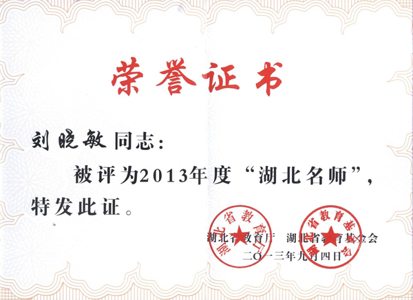 刘晓敏教授荣获2013年“湖北名师”称号,既是对他个人工作业绩的肯定,更是对beat365官网办学成就的充分肯定。