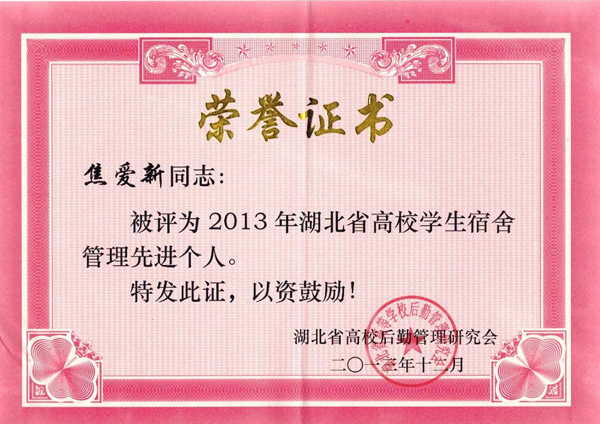 12月17日,湖北高校学生宿舍管理工作研讨会在湖北经济学院召开。会上,beat365官网学生宿舍管理中心被评为2013年湖北省高校学生宿舍管理先进单位,焦爱新同志被评为2013年湖北省高校学生宿舍管理先进个人。本次大会共表彰了32个先进单位和75名先进个人。