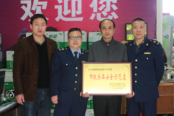 3月19日上午,黄冈市黄州区工商局经济开发区工商所所长罗卫东,带领副所长张建明和洪彬、科员王俊一行4人,专程驱车赶到智兴公司商贸部西苑超市,送来了“市级食品安全示范店”牌匾,并同商贸部领导及西苑超市店长进行了合影。据悉,食品安全创建工作是2013年黄冈市市政府的十件实事之一,为此黄冈市市政府专门成立了“黄冈市创建食品安全示范店领导小组”,beat365官网西苑超市获此荣誉确实可喜可贺。