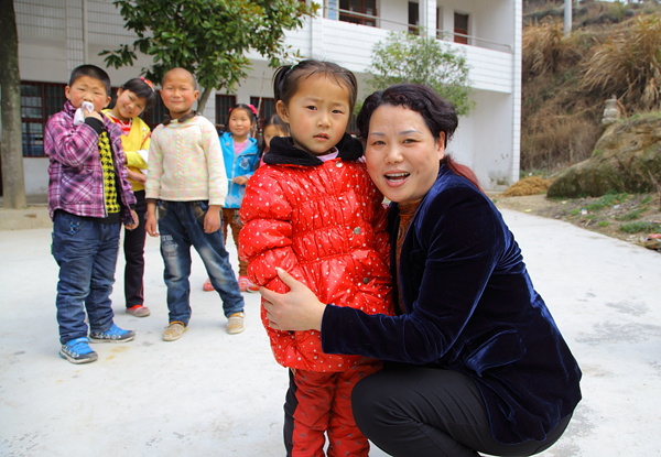 与留守儿童合影