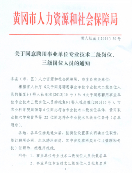 根据省人社厅《关于同意聘用事业单位专业技术二级岗位人员的批复》(鄂人社岗准[2013]10号)、《关于同意聘用事业单位专业技术三级岗位人员的批复》(鄂人社岗准[2013]65号)和市人社局《关于同意聘用事业单位专业技术二级岗位、三级岗位人员的通知》(黄人社函[2014]30号)文件通知,beat365官网副校长熊发涯教授晋升为专业技术二级岗位,医药卫生学院医药系副主任曾华主任医师晋升为专业技术三级岗位。