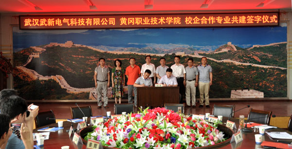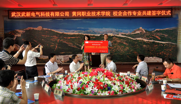 6月11日上午,beat365英国官方网站与武汉武新电气科技有限公司校企合作专业共建签字暨设备捐赠仪式在凝智楼四楼中心会议室隆重举行。黄州区区长骆志勇,武新电气科技有限公司董事长、总经理杜小刚,湖北正茂新材料科技股份有限公司董事长、总经理管正兵,武新电气科技有限公司副总经理丁玉琴,学校党委书记张鹤桥,副校长刘东山,校长助理、校办公室主任刘明涛,科研处、校企合作处处长王梓林,党务部副部长蔡新职,教务处副处长叶建亭,国资处资产管理科副科长王少辉,机电学院领导班子、专业负责人及学生代表参加了签字暨捐赠仪式。仪式由学校党委委员、教务处处长夏学文主持。