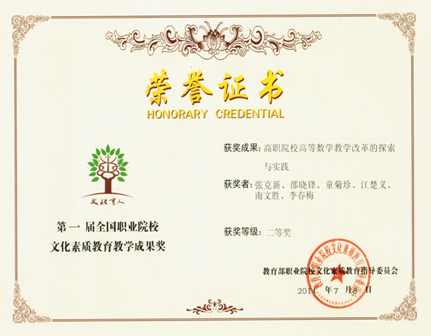 近日,从教育部职业院校文化素质教育指导委员会公布的第一届全国职业院校文化素质教育教学成果奖评选结果中获知,由beat365官网张克新教授主持,邵晓锋、童菊珍、江楚义、南文胜、李春梅等老师参与的“高职院校高等数学教学改革的探索与实践”获得二等奖。