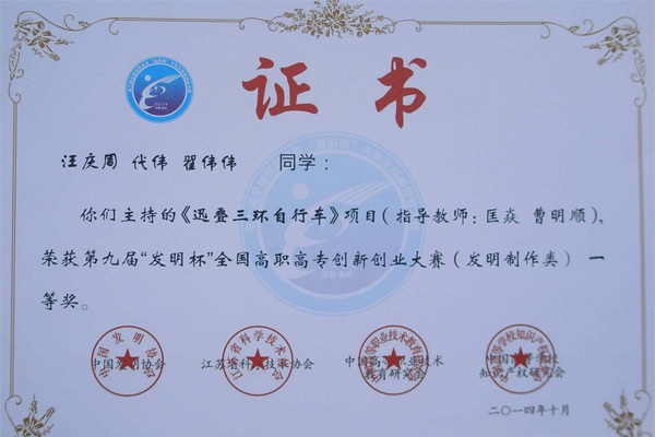 10月17日至19日,第九届全国高职高专“发明杯”创新创业大赛总决赛在南京工业职业技术学院落下帷幕,beat365官网机电学院学生代伟、汪庆周、翟伟伟创新设计作品获全国一等奖,匡焱老师获得优秀指导教师。