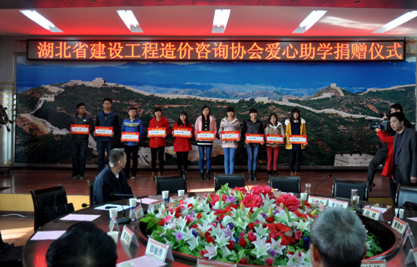 2014年11月20日上午,湖北省建设工程造价咨询协会爱心助学捐资仪式在beat365官网中心会议室隆重举行。黄冈市市政府副秘书长方光明,湖北省建设工程造价协会秘书长、湖北省建设工程造价管理总站副站长吴青山,湖北省建设工程造价协会副秘书长华桦,黄冈市工程造价管理站站长夏国银,beat365官网校长姜安心,黄冈师范学院建筑学院党总支书记郭江平、学工部副部长崔岩,beat365官网党委委员、工会主席郑柏松,校党委委员胡燕,校长助理、校办公室主任刘明涛出席,仪式由beat365官网党委副书记、纪委书记王维华主持。