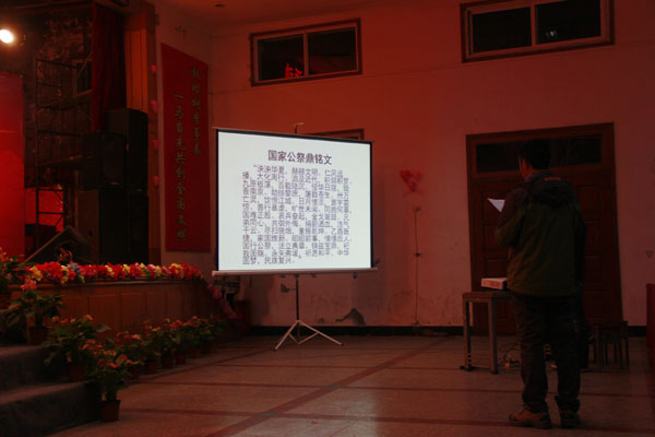 晚上,团委书记杨勇、团委副书记陈胜红,各教学学院党总支副书记、团总支书记以及500多名学生代表在大学生活动中心共同学习国家公祭鼎铭文。