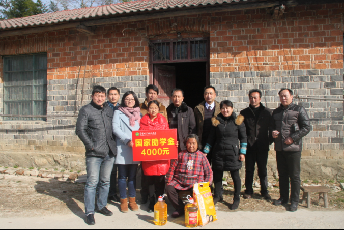 2014年12月12日,校学工处处长熊楚舒、医药卫生学院党委副书记徐火军带着医药卫生学院相关工作人员前往英山县陶家河乡严坳村,为助产201304班刘炟同学送去了4000元的国家助学金和油、米等生活用品。