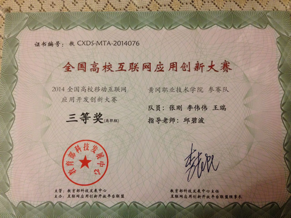 2014年12月13日,全国高校移动互联网应用开发创新大赛总决赛在北京圆满闭幕,电子信息学院张刚、李伟伟、王瑞3名同学开发的《掌上校园》荣获高职组三等奖。