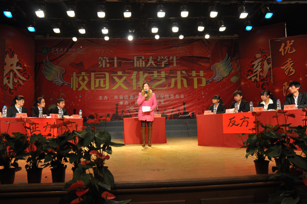 本届辩论赛由各学院及校团委学生会选派的8支代表队,分别进行了初赛、复赛以及决赛的激烈角逐。最终参加本场辩论、表演赛的选手,都是来自各学院的精英辩手。本场辩论、表演赛的辩题是“在校大学生创业利大于弊&在校大学生创业弊大于利”,场上双方辩手围绕这一辩题展开了激烈的辩论。双方队员慷慨陈词、引经据典;唇枪舌战、妙语如珠,语言犀利而不失风度,场下观众掌声阵阵,气氛热烈。辩论结束后,就业处何玲霞老师对本场辩论赛及双方辩手进行了精彩点评。最终,经场上评委评议,一致裁定本场表演赛的反方代表队获胜。