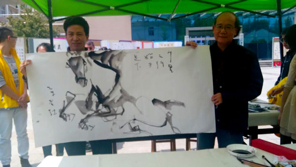 林荣光先生与副校长段院生展示林先生现场画作