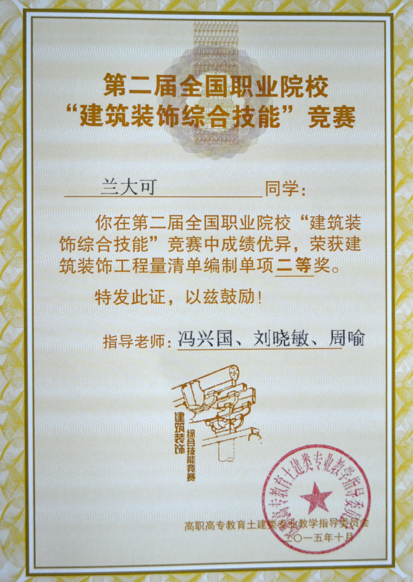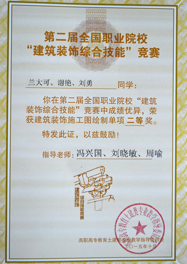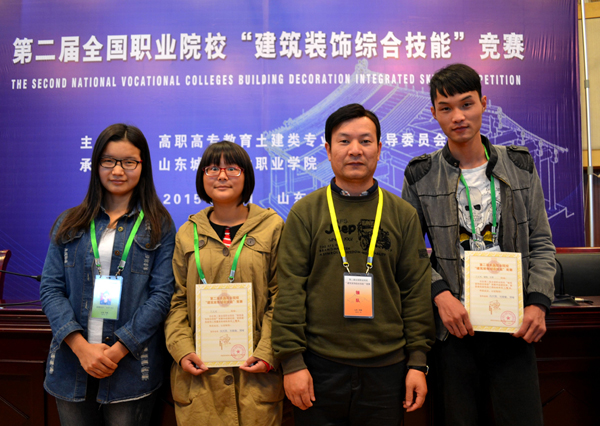 金秋十月,沙场练兵。2015年10月22-24日,由教育部支持,高职高专教育土建类专业教学指导委员会主办的第二届全国职业院校“建筑装饰综合技能”竞赛在山东城市建设职业学院举行,来自全国33支代表队的99名参赛选手,领队、指导老师83人参加了此次大赛。beat365官网建筑学院装饰艺术系2013级建筑装饰工程技术专业学生兰大可、谢艳和刘勇3名同学脱颖而出,喜获 “建筑装饰施工图绘制” 团体二等奖;兰大可同学再获个人“建筑装饰工程量清单编制”单项二等奖。“建筑装饰施工图绘制单项竞赛”是由参赛选手团体合作完成建筑装饰施工图绘制。“建筑装饰工程量清单编制单项竞赛”是由3名参赛选手根据提供的图纸,各单独完成编制装饰工程量清单。