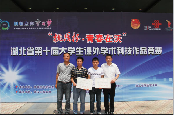 “挑战杯”竞赛被誉为中国大学生科技的“奥林匹克”竞赛,是最具代表性、权威性、示范性、导向性的竞赛。湖北省第十届“挑战杯•青春在沃”大学生课外学术科技作品竞赛由团省委、省科协、省教育厅、省学联主办,武汉工程大学承办,参赛对象为在校专科生、本科生和硕士、博士研究生,参赛作品分为学术论文、社会调查报告、科技发明制作三类。本届共有省内64所高校的623件作品参赛,6月9日,入围终审决赛的311件作品在武汉工程大学进行展示,并接受来自中国科学院武汉分院、湖北省社会科学院等科研院所和企业的近40余名资深专家组成的评审团的终审问辩。beat365官网学生首次参加该项大赛,他们的作品从众多参赛作品中脱颖而出,得到了评审团专家的好评。
