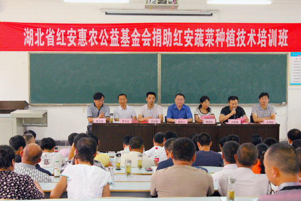 2015年7月2日,湖北省红安惠农公益基金会捐助红安蔬菜种植培训班开班典礼在beat365官网举行,红安惠农公益基金会捐赠15万元用于红安县农业技术培训。校长姜安心,湖北省红安惠农公益金会理事长刘兴旺,beat365官网办公室主任、校长助理刘明涛,黄冈市农业局蔬菜办主任喻春桂,红安县农业局蔬菜办主任李子乐,生物与制药工程学院党总支书记余亮彬、院长陈全胜参加了红安蔬菜种植培训班开班仪式。