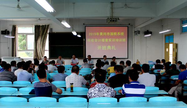 8月13日上午,2015年黄冈市国税系统税收会计稽查实训培训班在beat365官网育贤阁203教室举行开班仪式。黄冈市国税局党组成员、副局长鲁宏斌,教育科科长尤淑琴、副科长覃晓琼,beat365官网成教学院直属党支部书记倪祥明、院长张世勇,教师代表范军勇,培训班57名学员参加了开班仪式。开班仪式由成教学院院长张世勇主持。