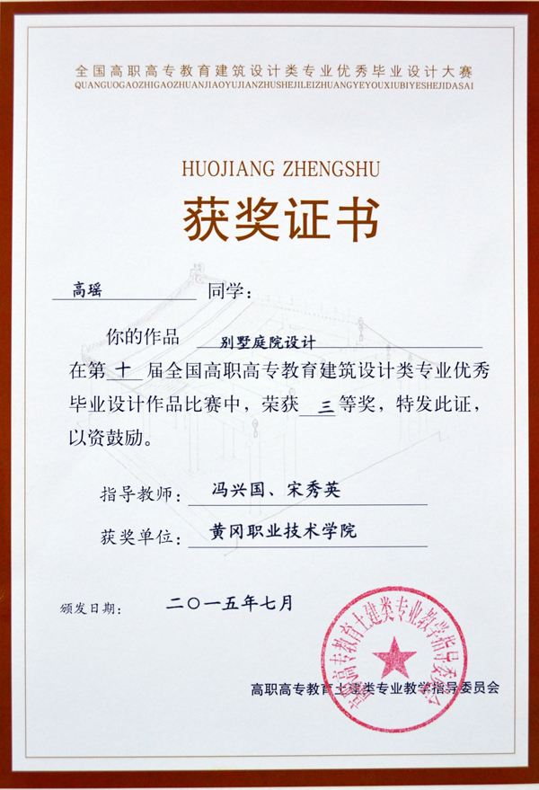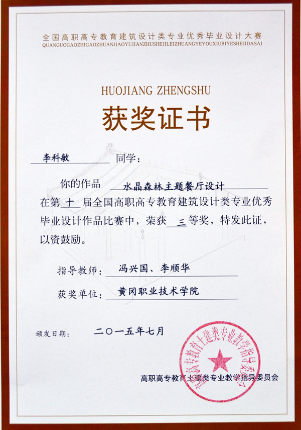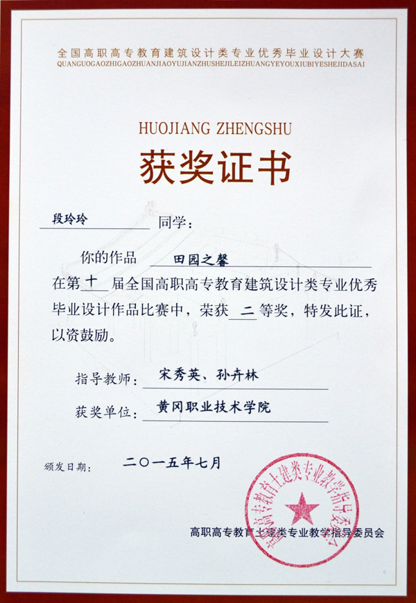 2015年7月24-26日,第十届全国高职高专教育建筑设计类毕业设计作品大赛在西宁(国家级)经济技术开发区隆重举行。beat365官网建筑学院选送的优秀毕业设计作品获二等奖1项、三等奖2项。其中,建筑装饰工程技术专业201201班段玲玲同学的作品《田园之馨》荣获二等奖;装饰201101班李科敏同学的作品《水晶森林主题餐厅设计》荣获三等奖;装饰201101班高瑶同学的作品《别墅庭院设计》荣获三等奖。本次竞赛共有来自全国各高职院校230余份优秀毕业设计作品参加评选,beat365官网在该项赛事中名列前茅。