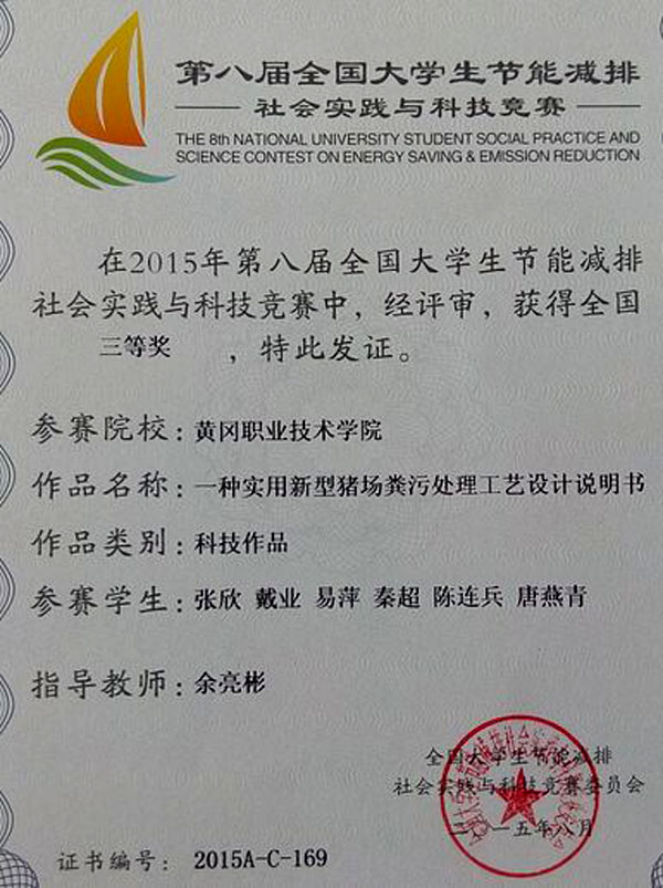 近日,第八届全国大学生节能减排社会实践与科技竞赛落下帷幕,beat365官网生物与制药工程学院畜牧兽医专业余亮彬副教授指导的,2013级学生张欣、戴业、易萍等6人组成的参赛团队,与知名高校硕士生、本科生同场竞技,所申报的参赛作品《一种实用新型猪场粪污处理工艺设计》获得科技类三等奖。