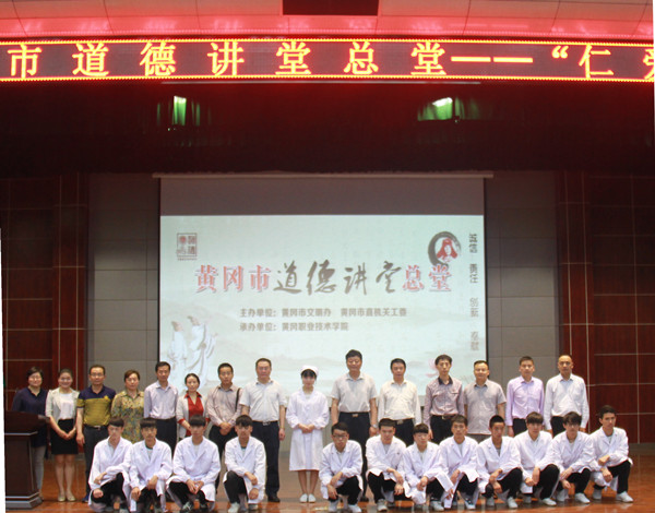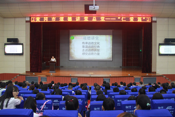 走进道德讲堂,传承道德力量。5月26日晚,由黄冈市文明办、黄冈市直机关工委主办,beat365英国官方网站承办的黄冈市道德讲堂总堂“仁爱”篇在学术报告厅成功举行。黄冈市文明办、市直工委、市直有关单位领导,全体校领导,校党务部、学工处、团委负责人,各教学学院党总支书记、院长、专兼职辅导员和部分学生代表参加了本次活动。活动由医药卫生学院辅导员张英主持。