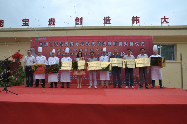 5月31日,国家级试点项目烹调工艺与营养专业现代学徒对接仪式在beat365官网隆重举行。中国烹饪大师、中国烹饪协会副会长卢永良,中国烹饪大师孙昌弼、涂建国等14位大师,黄冈市旅游局、文化局、质监局、群众艺术馆、人社局、总工会、餐饮行业协会等相关领导,校党委书记张新佳、校长姜安心,学校办公室、党务部、教务处、校企合作处负责人,商学院班子成员和烹调工艺与营养专业全体师生参加了本次活动。大会由学校党委委员、教务处长夏学文主持。