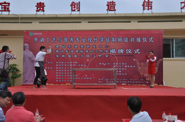 活动中,张新佳、卢永良为中国烹饪大师(张彬)创新工作室揭牌,姜安心、孙昌弼为中国黄冈东坡菜研发中心揭牌,涂建国、黄冈市餐饮酒店行业协会会长曾德福为中国黄冈东坡菜标准化工作室揭牌。张新佳向卢永良、孙昌弼、涂建国颁发了黄冈职院客座教授聘书,向张彬颁发了中国烹饪大师(张彬)创新工作室主任聘书。姜安心向黄冈职院现代学徒制试点合作单位黄冈大东方餐饮服务有限公司、纽宾凯瓦尔登大酒店、眉州东坡酒楼等10个合作单位授牌,向张彬、杨翔等11 位大师颁发了黄冈职院烹调工艺与营养专业现代学徒制师傅聘书。卢永良、孙昌弼展示了自己的题词、画作,诠释了烹饪是科学、技术、艺术的有机统一。
