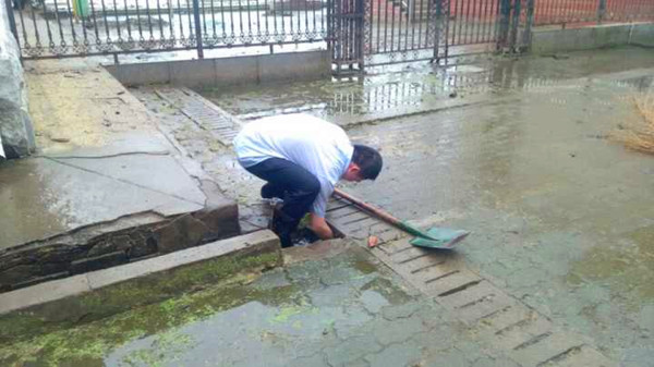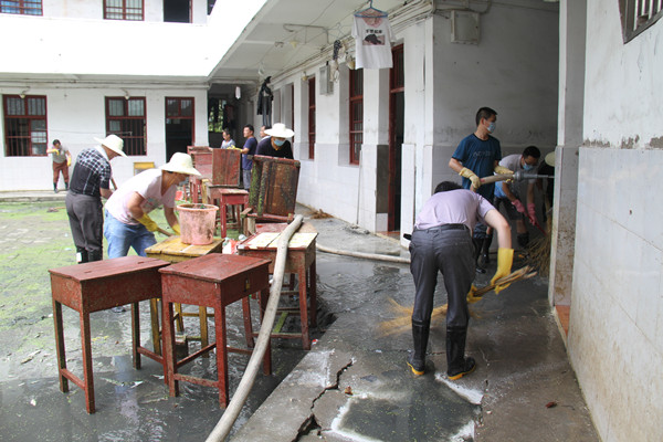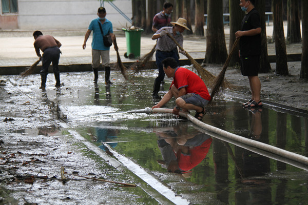广大教职员工全员上岗,将办公桌椅和设备一点一点向外转移,用高压水枪配合着扫帚清理淤泥及落叶垃圾。他们的脚踩进泥浆,笨重的铁锹一下一下将污泥和垃圾舀进桶里,铁锹够不到的地方,就蹲下去用手捧,身上的衣服一次次被汗水浸透……