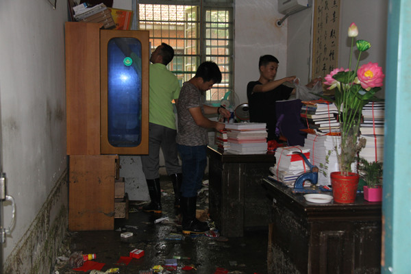 洪水退去,大量淤泥、树叶树枝、生活垃圾堆积在街道,被洪水浸泡多日的房间发出阵阵恶臭,校园内一片狼藉……
