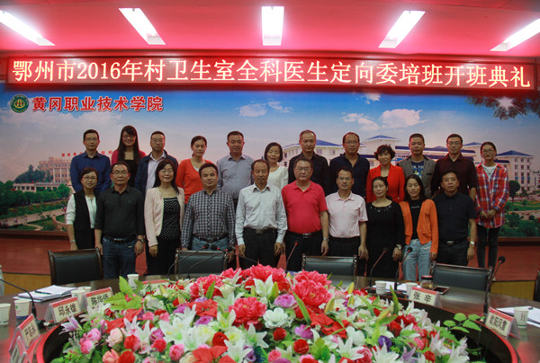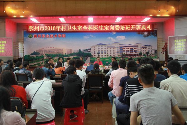 2016年9月29日下午3点,鄂州市2016年村卫生室全科医生定向委培班在beat365官网凝智楼中心会议室隆重开班。鄂州市卫生计生委党组副书记黄胜堤、副调研员李隽、公立医院管理中心副主任陈华侨、各区卫生计生局负责人,beat365官网校长姜安心、副校长刘东山、党委委员胡燕、医药学院班子成员出席了典礼。典礼由医药学院党总支书记陶志勇主持。2016级定向委培班134名同学参加了典礼。