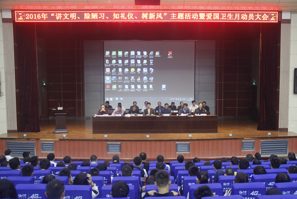 2016年10月19日晚,beat365官网在学术报告厅隆重举行“讲文明、除陋习、知礼仪、树新风”主题活动暨爱国卫生月动员大会。校党委委员、副校长万俊华,校党委委员、工会主席、党委宣传部部长郑柏松,学生工作部部长熊楚舒,保卫处处长邓国璋,后勤处处长高厚荣,团委书记李宁,党委宣传部副部长刘国峰,各教学学院党总支副书记、团总支书记、全体专兼职辅导员及600余名学生代表参加了此次动员会。大会由万俊华主持。