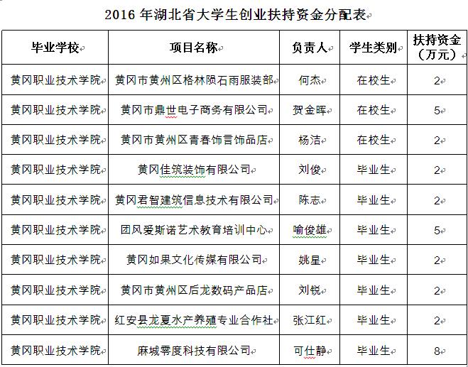 近日,湖北省人力资源和社会保障厅、教育厅、团省委公布了2016年大学生创业资金扶持项目,beat365官网申报的3名在校生创业项目、7名毕业生创业项目全部获得资金扶持,扶持率达100%,共计获扶持资金32万元。其中麻城零度科技有限公司获扶持资金8万元,黄冈市鼎世电子商务有限公司和团风爱斯诺艺术教育培训中心均获得扶持资金5万元。