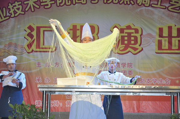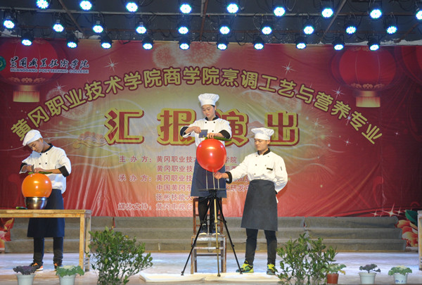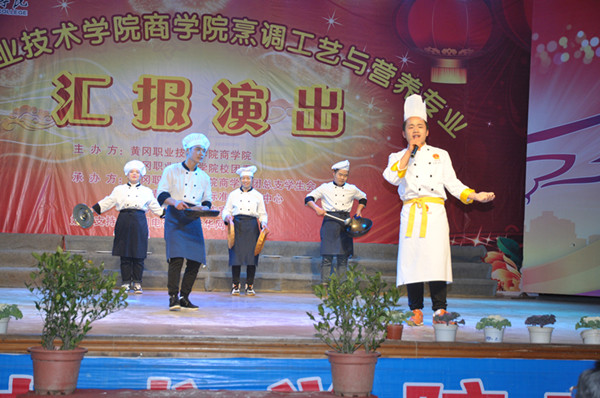 活动在郑柏松的致词中拉开序幕,他针对活动主题及内容展开阐述,并对出席活动的嘉宾表示欢迎。汇报演出以舞蹈《水源》作为开场,唯美的灯光优美的舞蹈迅速将大家带到晚会中。由烹饪专业的学生表演《钢针气球上切黄瓜》《一品千丝》充分展示了学生精湛的刀功,细腻的刀法。中国传统面食中《长寿一根面》《抻面》的制作,展现出烹饪既是技艺又是艺术。随后,烹饪专业师生制作的《分子美食》《珊瑚糖艺》《液氮爆米花》,这是科学融入烹饪中的最直观的展示。由许筱给大家带来的快板说唱湖北美景,将美食文化与美景充分地融合在一起。最后烹饪专业学生带来菜品展示将汇报演出活动推向高潮。东坡肉、东坡饼、武昌鱼、全家福、珊瑚桂鱼、菊花西芹……一道道精美的菜点呈现在嘉宾面前,热烈的掌声是大家对学生的肯定和鼓励。最后,活动在夏学文的总结中圆满落幕。