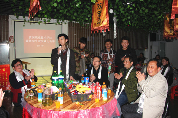 2017年2月27日,藏历火鸡年新年。学校南苑食堂二楼,欢歌笑语,100余名藏族学生在此欢度新年。学校党委委员、工会主席、党委宣传部长郑柏松,学工处处长熊楚舒,团委书记李宁,生物与制药工程学院党总支副书记程喜荣,商学院党总支副书记汤城,医药学院党总支副书记欧阳风雷,生物与制药工程学院、商学院、医药学院相关辅导员老师与全校藏族学生一起参加了庆祝活动。
