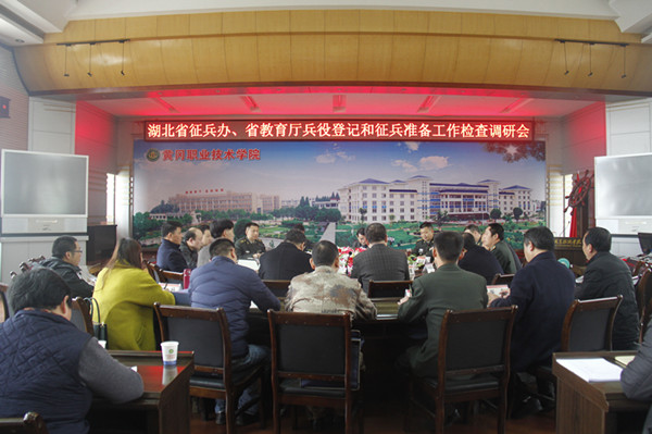 3月23日上午,省征兵办调研员黄辉斌,省教育厅科长陈彬,省军区动员处参谋王沛,黄冈军分区参谋长谢庆前、军分区司令部军动科姚红波、军分区司令部参谋长董胜斌,黄冈市教育局副局长瞿建新、科长徐宙,区武装部政委王雄兵、副部长梅军、参谋柳位超一行11人来beat365官网检查调研黄冈高校征兵工作。黄冈师范学院学工部部长、武装部部长钟劲松,黄冈科技职业学院党委书记汤伯意,beat365官网党委书记张新佳、校长姜安心、工会主席郑柏松,学生工作部(处)、武装部部长熊楚舒、副处长吴冬及各学院党总支副书记在中心会议室参加了会议。