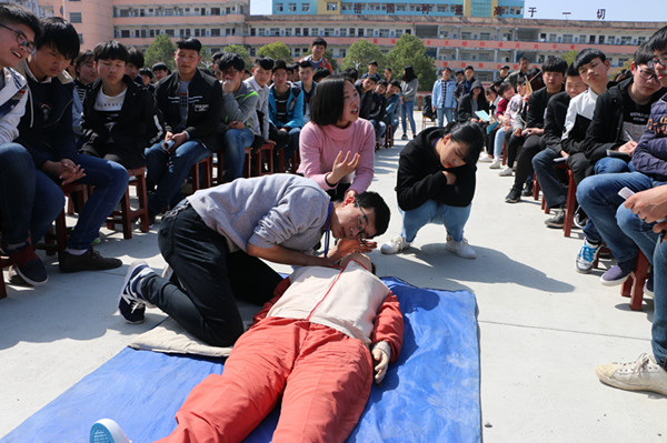 本活动以弘扬“人道、博爱、奉献”的红十字精神为宗旨,针对中学生的成长规律,护理学院吴涛和彭晶老师带领护理协会学生,以现场讲解与演练相结合的方式,开展了防止踩踏、现场心肺复苏、气道异物梗阻等的救护知识讲座,向蕲春三中的同学演示了 “人体麦克风”、传授了现场心肺复苏技术和海姆立克手法等应急救护技能。现场气氛活跃,师生互动有序,在普及传授现场应急救护知识的同时,也激发了广大青年学生积极参与应急救援志愿服务的热情。