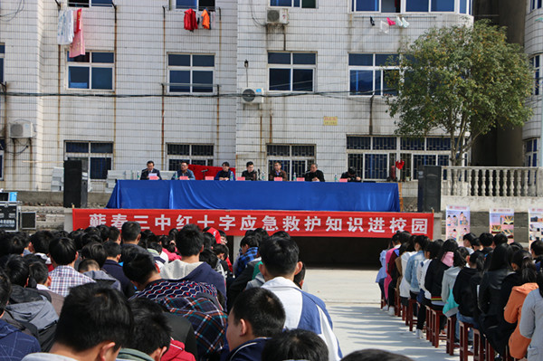 2017年3月27日上午10:00,由黄冈市教育局、黄冈市红十字会联合举办,beat365英国官方网站护理学院承办的“应急救护”知识进校园公益活动在蕲春三中隆重召开,黄冈市教育局党组成员、工会主席刘立志,法制安全科科长孙兵,黄冈市红十字会副会长李伦,beat365英国官方网站护理学院党总支书记王莹华、副书记张朋生出席本次仪式。