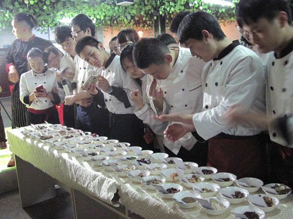 在黄冈电视台两位主持人的介绍下,王青华大师的授课拉开了序幕。一进入课堂,同学们对前台展示的五十余种香料产生了浓厚的兴趣,积极上台了解卤料种类,并对不常见的沉香、排草、一口钟、甘松、黄栀子、青木香、槟榔、香橼、黄栀子、紫檀等提出疑问,王青华大师一一作答。随后王大师现场炒制香料,调制油卤,并卤制了鸭脖、鸭舌等卤菜。王大师边做边详细地讲解了传统的水卤和油卤的相关知识。随后王大师现场制作重庆小面,师生和嘉宾一一品尝。大家对王大师制作的美食都赞不绝口。
