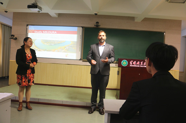 根据行程安排,Fyfe先生首先在学校视录室给酒店管理专业40余名学生作了一堂题为International Education in SuniTAFE的讲座,他介绍了SuniTAFE(桑瑞亚理工学院)的基本情况,特别是最近几年快速发展的国际教育,并欢迎同学们去该校读书深造。