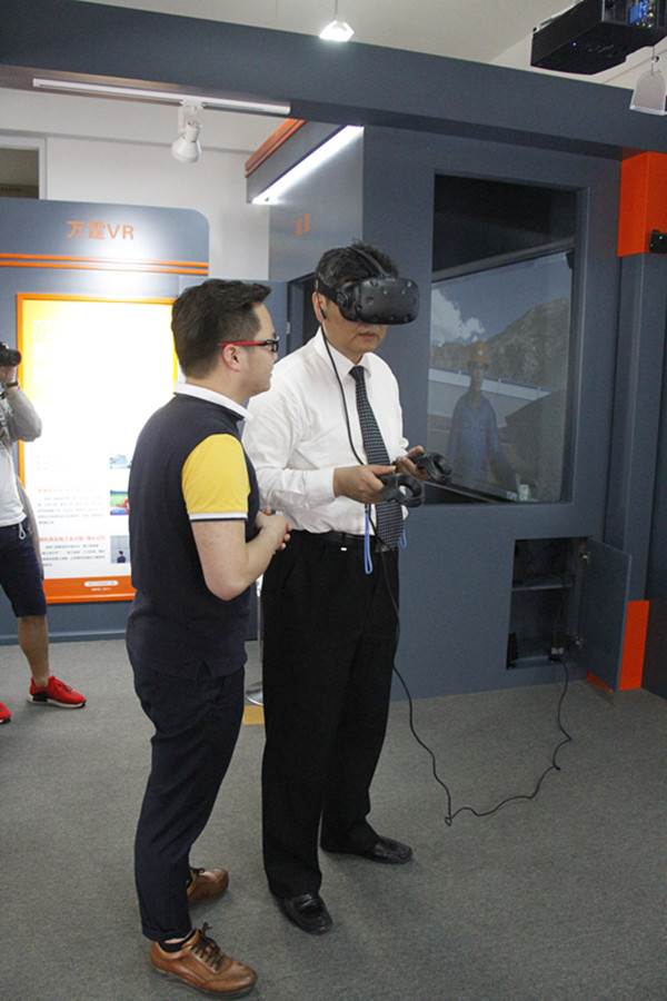 会议后,大家来到建筑学院二楼实训室进行校企合作VR云体验中心的参观、VR体验厅的现场体验,共同见证了VR技术改变了教学模式的魅力。