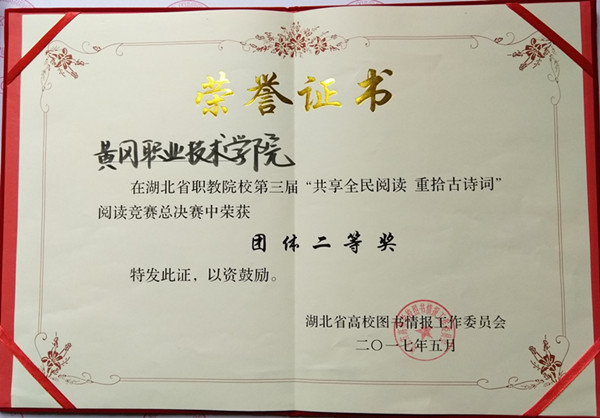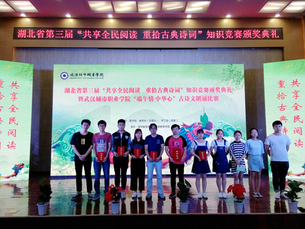 2017年5月27日下午,湖北省高职院校“共享全民阅读 重拾古典诗词”阅读竞赛总决赛,在武汉城市职业学院图书馆隆重举行,来自全省32所高职院校的100名学生参加了现场决赛,beat365官网代表队荣获团体二等奖,护理学院中护理201501班王盼、医药学院临床201601班郭小玲分获个人二等奖,电子信息学院互联网201604班顾宇晨、生物与制药工程学院园林201601班周鹏分获个人三等奖,徐学斌获“优秀指导老师”。